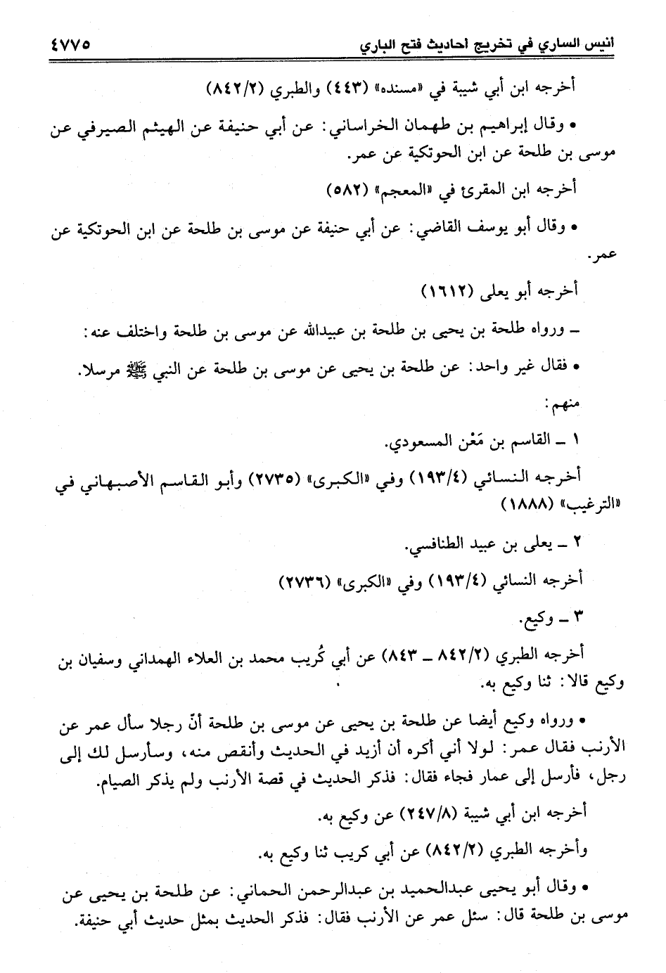 • وقال أبو يحيى عبد الحميد بن عبد الرحمن الحماني: عن طلحة بن يحيى عن موسى بن طلحة قال: سئل عمر عن الأرنب فقال: فذكر الحديث بمثل حديث أبي حنيفة.