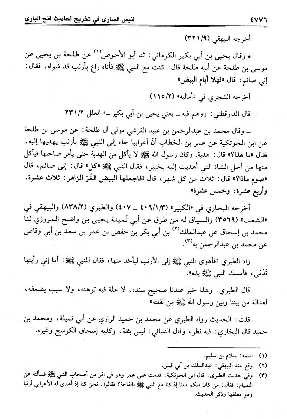 • وقال يحيى بن أبي بكير الكرماني: ثنا أبو الأحوص (¬1) عن طلحة بن يحيى عن موسى بن طلحة عن أبيه طلحة قال: كنت مع النبي - صلى الله عليه وسلم - فأتاه راع بأرنب قد شواه، فقال: إني صائم، قال "فهلا أيام البيض"