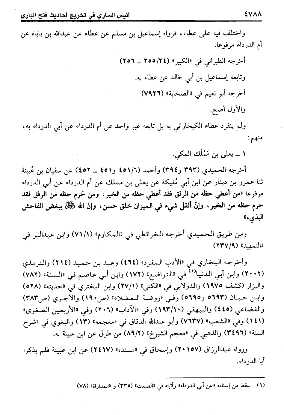 أخرجه الحميدي (393 و 394) وأحمد (6/ 451 و 451 - 452) عن سفيان بن عُيينة ثنا عمرو بن دينار عن ابن أبي مُليكة عن يعلي بن مملك عن أم الدرداء عن أبي الدرداء مرفوعا "من أعطي حظه من الرفق فقد أعطي حظه من الخير، ومن حُرم حظه من الرفق فقد حرم حظه من الخير، وإنّ أثقل شيء في الميزان خلق حسن، وإنّ الله عز وجل يبغض الفاحش البذيء"