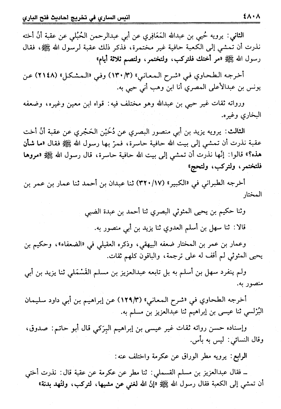 الثالث: يرويه يزيد بن أبي منصور البصري عن دُخَيْن الحَجْري عن عقبة أنّ أخت عقبة نذرت أن تمشي إلى بيت الله حافية حاسرة، فمرّ بها رسول الله - صلى الله عليه وسلم - فقال "ما شأن هذه؟ " قالوا: إنّها نذرت أن تمشي إلى بيت الله حافية حاسرة، قال رسول الله - صلى الله عليه وسلم - "مروها فلتختمر، ولتركب، ولتحج"