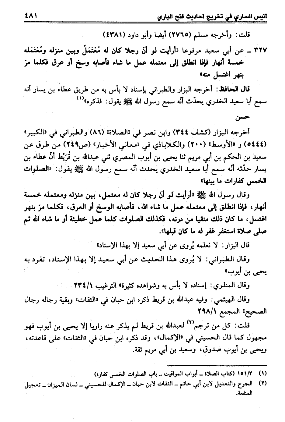 327 - عن أبي سعيد مرفوعا "أرأيت لو أنّ رجلا كان له مُعْتَمَلٌ وبين منزله ومُعْتَمَله خمسة أنهار فإذا انطلق إلى معتمله عمل ما شاء فأصابه وسخ أو عرق فكلما مرّ بنهر اغتسل منه"