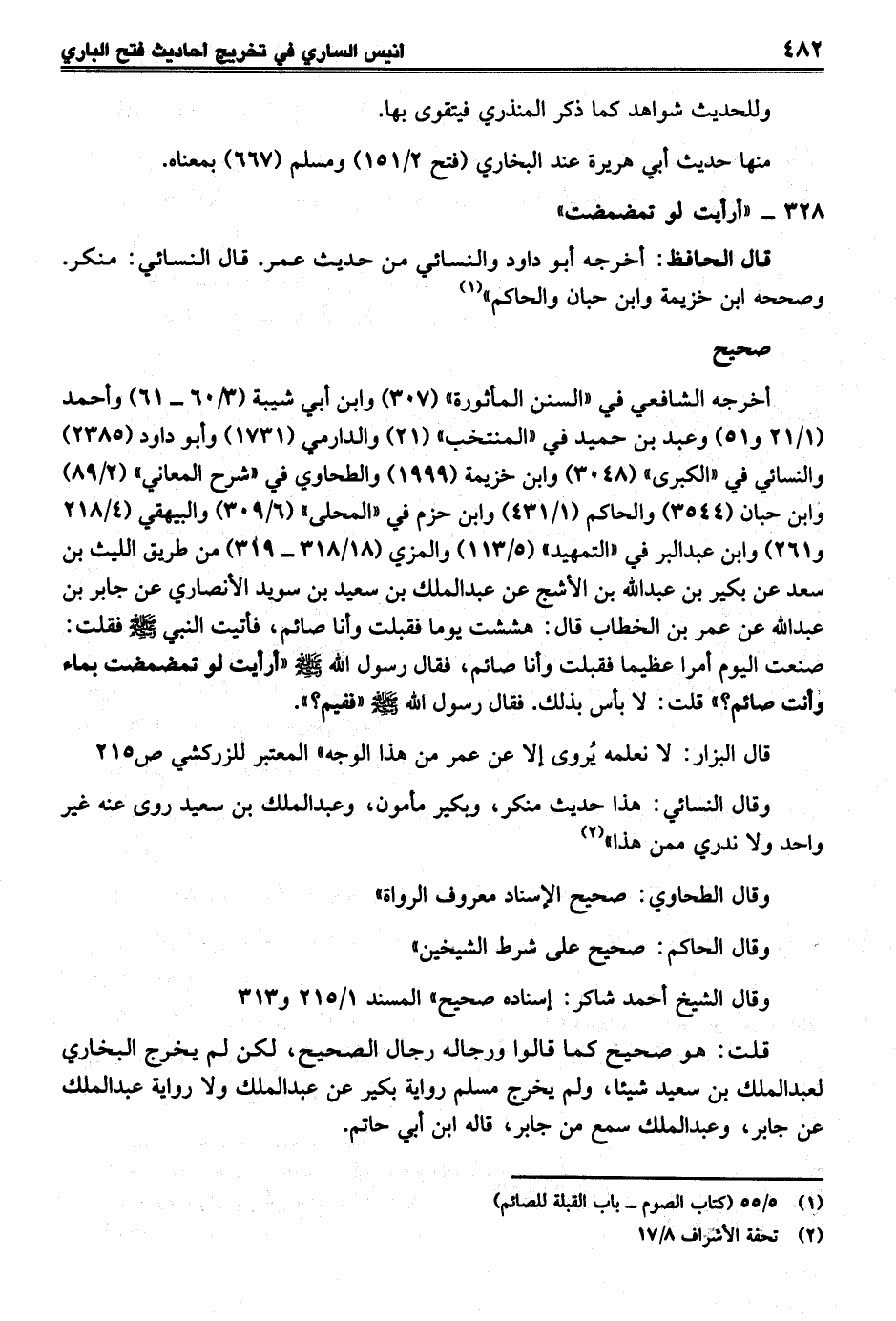 أخرجه الشافعي في "السنن المأثورة" (307) وابن أبي شيبة (3/ 60 - 61) وأحمد (1/ 21 و 51) وعبد بن حميد في "المنتخب" (21) والدارمي (1731) وأبو داود (2385) والنسائي في "الكبرى" (3048) وابن خزيمة (1999) والطحاوي في "شرح المعاني" (2/ 89) وابن حبان (3544) والحاكم (1/ 431) وابن حرّم في "المحلى" (6/ 309) والبيهقي (4/ 218 و 261) وابن عبد البر في "التمهيد" (5/ 113) والمزي (18/ 318 - 319) من طريق الليث بن سعد عن بكير بن عبد الله بن الأشج عن عبد الملك بن سعيد بن سويد الأنصاري عن جابر بن عبد الله عن عمر بن الخطاب قال: هششت يوما فقبلت وأنا صائم، فأتيت النبي - صلى الله عليه وسلم - فقلت: صنعت اليوم أمرا عظيما فقبلت وأنا صائم، فقال رسول الله - صلى الله عليه وسلم - "أرأيت لو تمضمضت بماء وأنت صائم؟ " قلت: لا بأس بذلك. فقال رسول الله - صلى الله عليه وسلم - "ففيم؟ ".