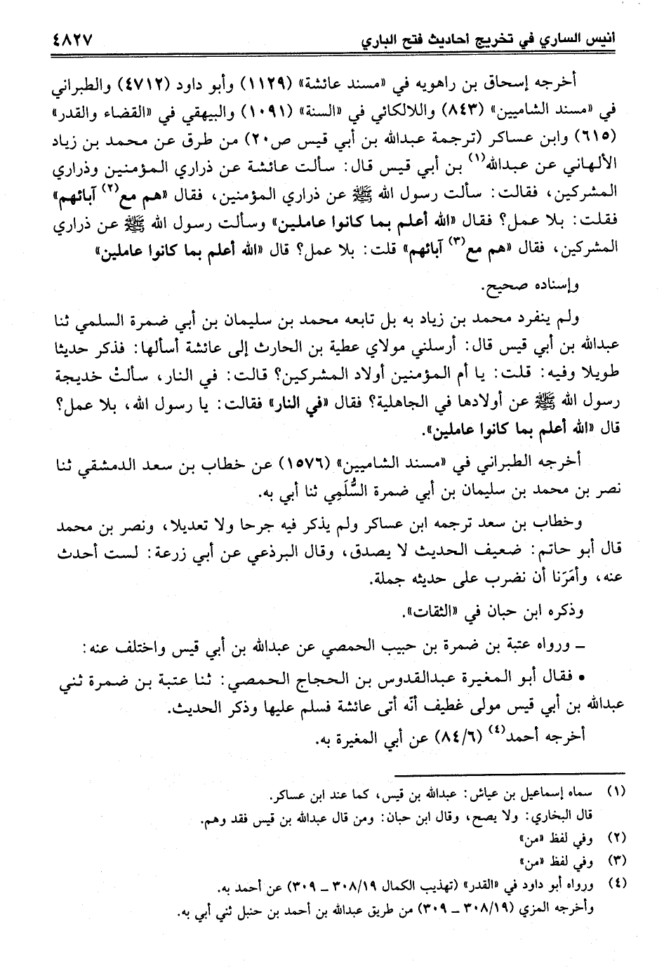 أخرجه إسحاق بن راهويه في "مسند عائشة" (1129) وأبو داود (4712) والطبراني في "مسند الشاميين" (843) واللالكائي في "السنة" (1091) والبيهقي في "القضاء والقدر" (615) وابن عساكر (ترجمة عبد الله بن أبي قيس ص 20) من طرق عن محمد بن زياد الألهاني عن عبد الله (¬1) بن أبي قيس قال: سألت عائشة عن ذراري المؤمنين وذراري المشركين، فقالت: سألت رسول الله -صلى الله عليه وسلم- عن ذراري المؤمنين، فقال"هم مع (¬2) آبائهم" فقلت: بلا عمل؟ فقال "الله أعلم بما كانوا عاملين" وسألت رسول الله -صلى الله عليه وسلم- عن ذراري المشركين، فقال "هم مع (¬3) آبائهم" قلت: بلا عمل؟ قال "الله أعلم بما كانوا عاملين"