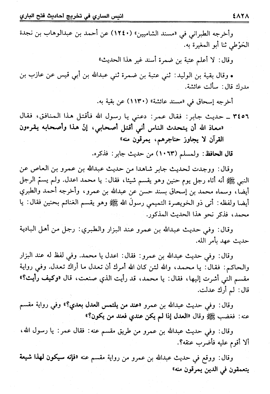 3456 - حديث جابر: فقال عمر: دعني يا رسول الله فأقتل هذا المنافق، فقال "معاذ الله أن يتحدث الناس أني أقتل أصحابي، إنّ هذا وأصحابه يقرءون القرآن لا يجاوز حناجرهم، يمرقون منه"