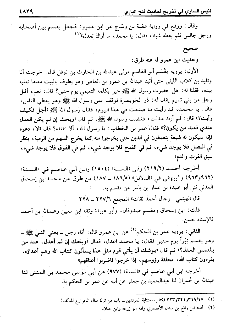 الأول: يرويه مِقْسَم أبو القاسم مولى عبد الله بن الحارث بن نوفل قال: خرجت أنا وتليد بن كلاب الليثي حتى أتينا عبد الله بن عمرو بن العاص وهو يطوف بالبيت معلقا نعليه بيده، فقلنا له: هل حضرت رسول الله -صلى الله عليه وسلم- حين يكلمه التميمي يوم حنين؟ قال: نعم، أقبل رجل من بني تميم يقال له: ذو الخويصرة فوقف على رسول الله -صلى الله عليه وسلم-وهو يعطي الناس، قال: يا محمد، قد رأيت ما صنعت في هذا اليوم، فقال رسول الله -صلى الله عليه وسلم- "أجل فكيف رأيت؟ " قال: لم أرك عدلت، فغضب رسول الله -صلى الله عليه وسلم-، ثم قال "ويحك إن لم يكن العدل عندي فعند من يكون؟ " فقال عمر بن الخطاب: يا رسول الله، ألا نقتله؟ قال "لا، دعوه فإنه سيكون له شيعة يتعمقون في الدين حتى يخرجوا منه كما يخرج السهم من الرمية، ينظر في النصل فلا يوجد شيء، ثم في القدح فلا يوجد شيء، ثم في الفوق فلا يوجد شيء، سبق الفرث والدم"