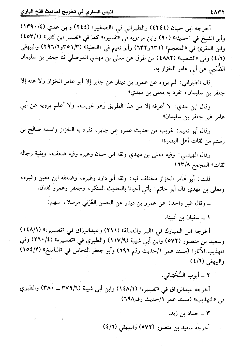 قال الطبراني: لم يروه عن عمرو بن دينار عن جابر إلا أبو عامر الخزاز ولا عنه إلا جعفر بن سليمان، تفرد به معلي بن مهدي"