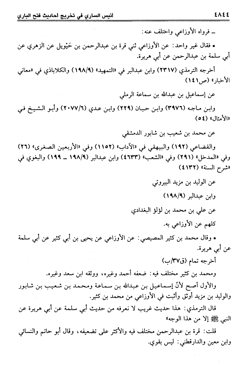• فقال غير واحد: عن الأوزاعي ثني قرة بن عبد الرحمن بن حَيْويل عن الزهري عن أبي سلمة بن عبد الرحمن عن أبي هريرة.