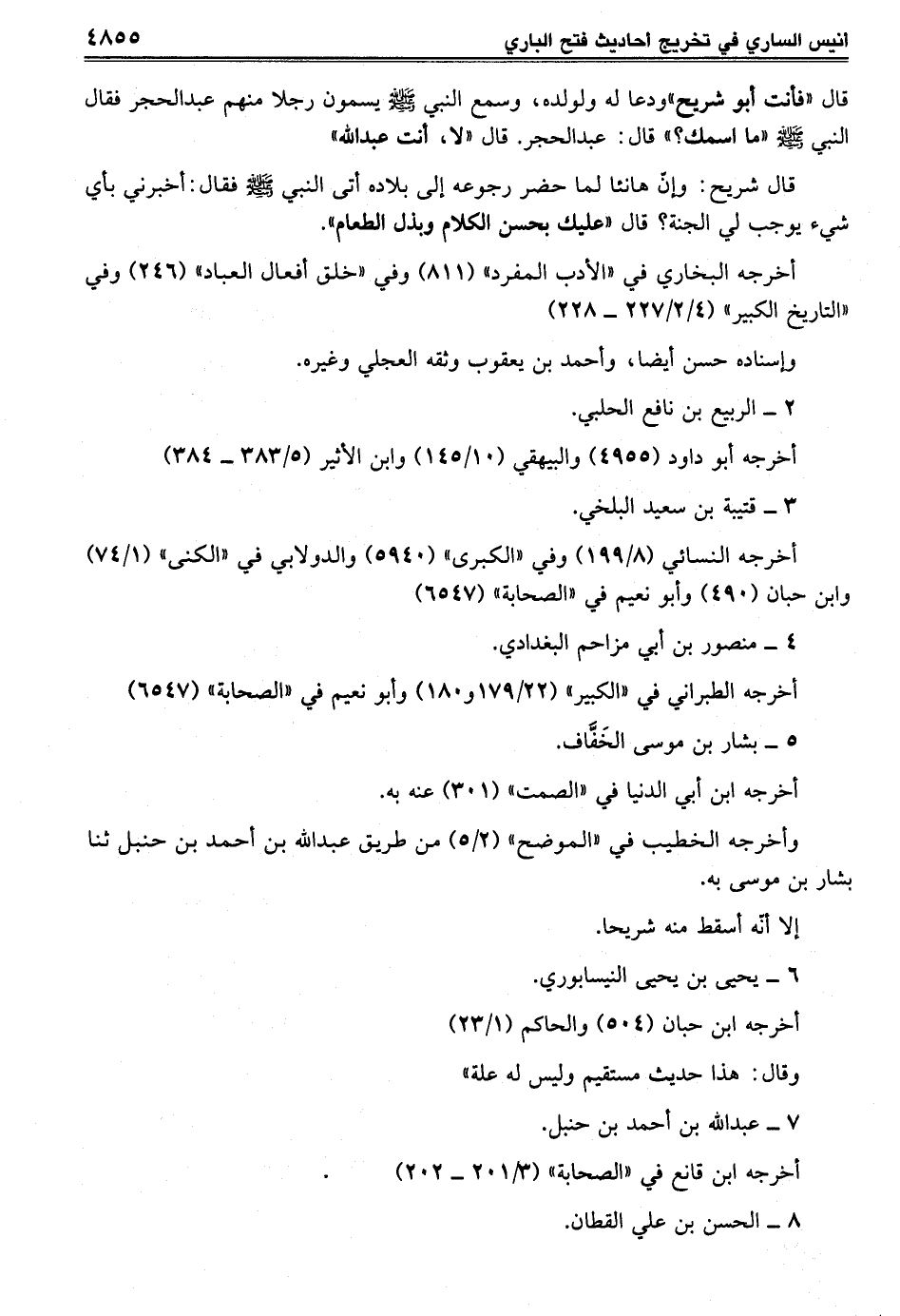 قال "فأنت أبو شريح" ودعا له ولولده، وسمع النبي -صلى الله عليه وسلم- يسمون رجلا منهم عبد الحجر فقال النبي -صلى الله عليه وسلم- "ما اسمك؟ " قال: عبد الحجر. قال "لا، أنت عبد الله"