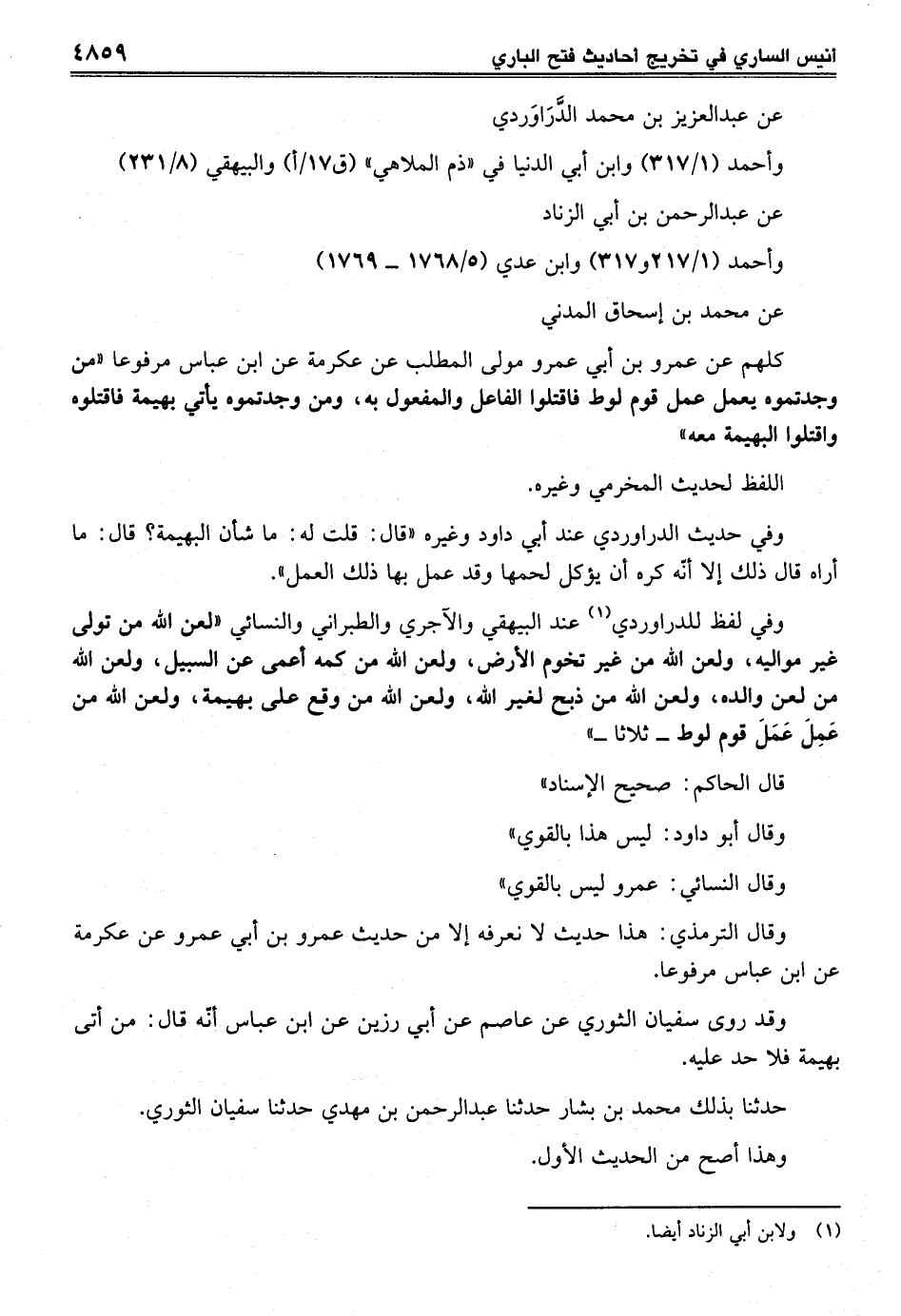 كلهم عن عمرو بن أبي عمرو مولى المطلب عن عكرمة عن ابن عباس مرفوعا "من وجدتموه يعمل عمل قوم لوط فاقتلوا الفاعل والمفعول به، ومن وجدتموه يأتي بهيمة فاقتلوه واقتلوا البهيمة معه"
