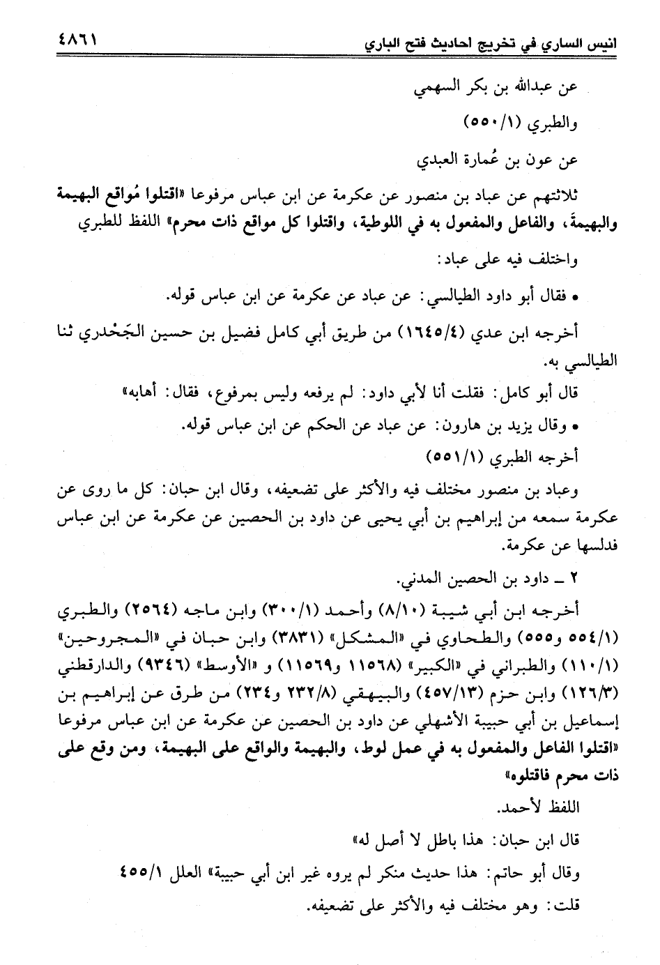 ثلاثتهم عن عباد بن منصور عن عكرمة عن ابن عباس مرفوعا "اقتلوا مُواقع البهيمة والبهيمةَ، والفاعل والمفعول به في اللوطية، واقتلوا كل مواقع ذات محرم" اللفظ اللطبري