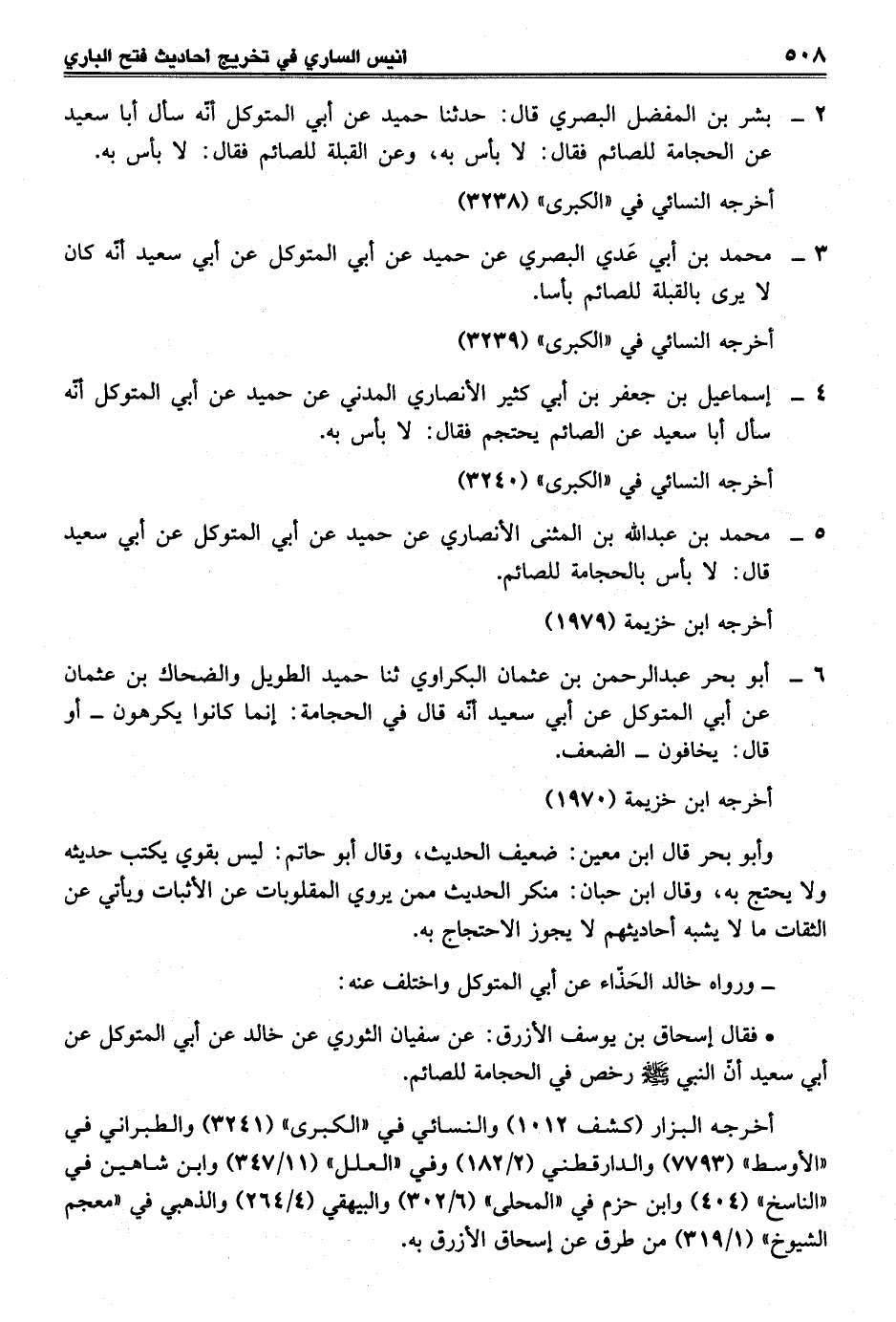 6 - أبو بحر عبد الرحمن بن عثمان البكراوي ثنا حميد الطويل والضحاك بن عثمان عن أبي المتوكل عن أبي سعيد أنّه قال في الحجامة: إنما كانوا يكرهون - أو قال: يخافون - الضعف.