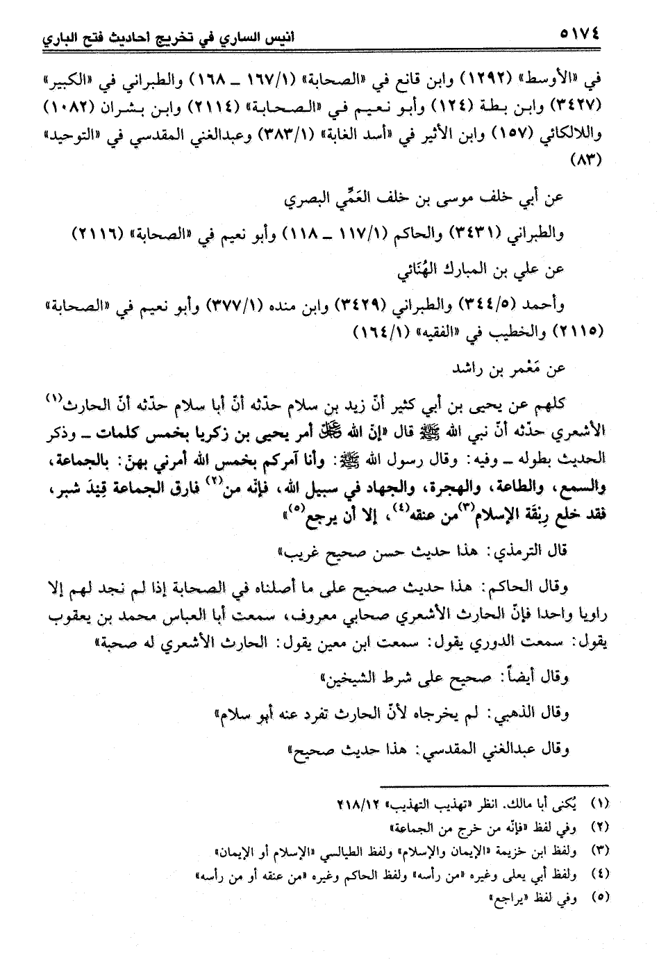 وقال الحاكم: هذا حديث صحيح على ما أصلناه في الصحابة إذا لم نجد لهم إلا راويا واحدا فإنّ الحارث الأشعري صحابي معروف، سمعت إبا العباس محمد بن يعقوب يقول: سمعت الدوري يقول: سمعت ابن معين يقول: الحارث الأشعري له صحبة"