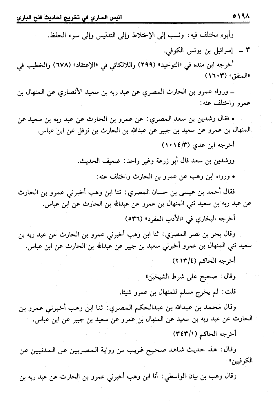 • فقال رشدين بن سعد المصري: عن عمرو بن الحارث عن عبد ربه بن سعيد عن المنهال بن عمرو عن سعيد بن جبير عن عبد الله بن الحارث بن نوفل عن ابن عباس.