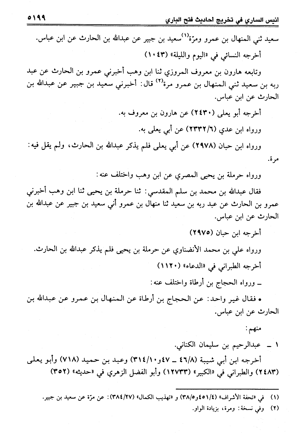 وتابعه هارون بن معروف المروزي ثنا ابن وهب أخبرني عمرو بن الحارث عن عبد ربه بن سعيد ثني المنهال بن عمرو مرة (¬2) قال: أخبرني سعيد بن جبير عن عبد الله بن الحارث عن ابن عباس.