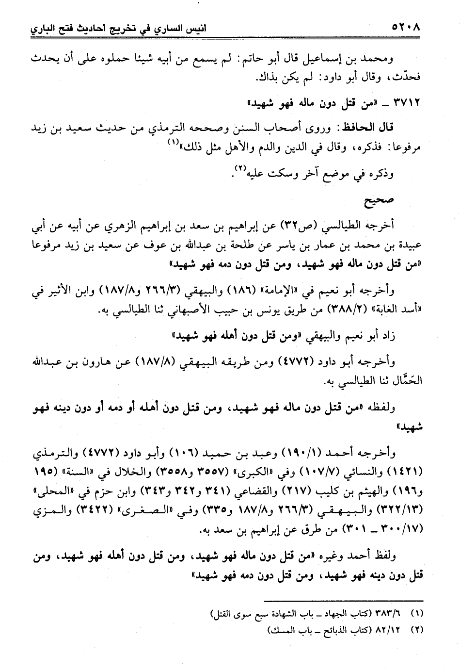 ولفظ أحمد وغيره "من قتل دون ماله فهو شهيد، ومن قتل دون أهله فهو شهيد، ومن قتل دون دينه فهو شهيد، ومن قتل دون دمه فهو شهيد"