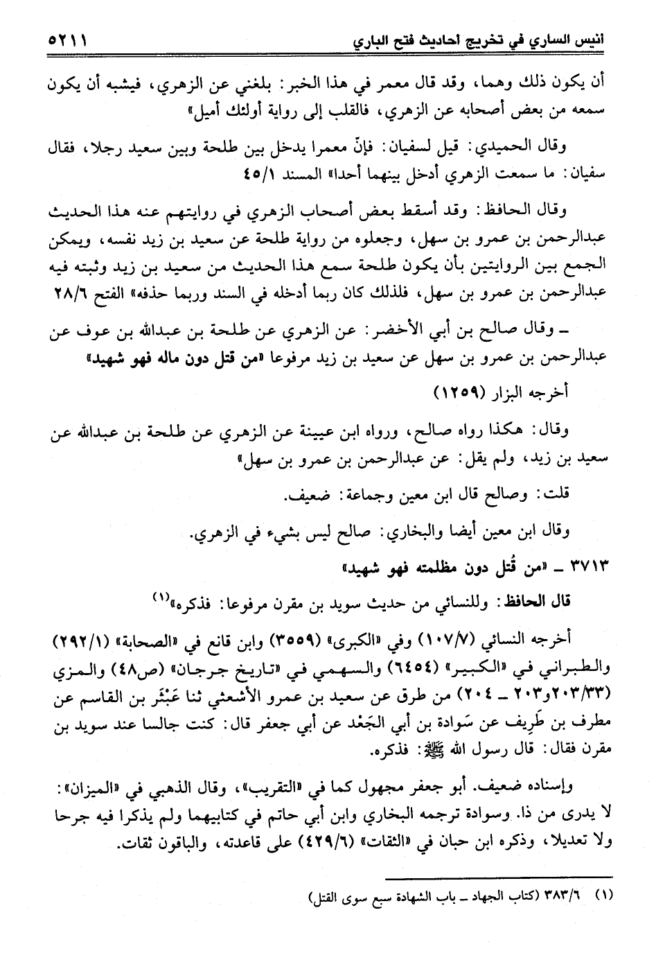 - وقال صالح بن أبي الأخضر: عن الزهري عن طلحة بن عبد الله بن عوف عن عبد الرحمن بن عمرو بن سهل عن سعيد بن زيد مرفوعاً "من قتل دون ماله فهو شهيد"