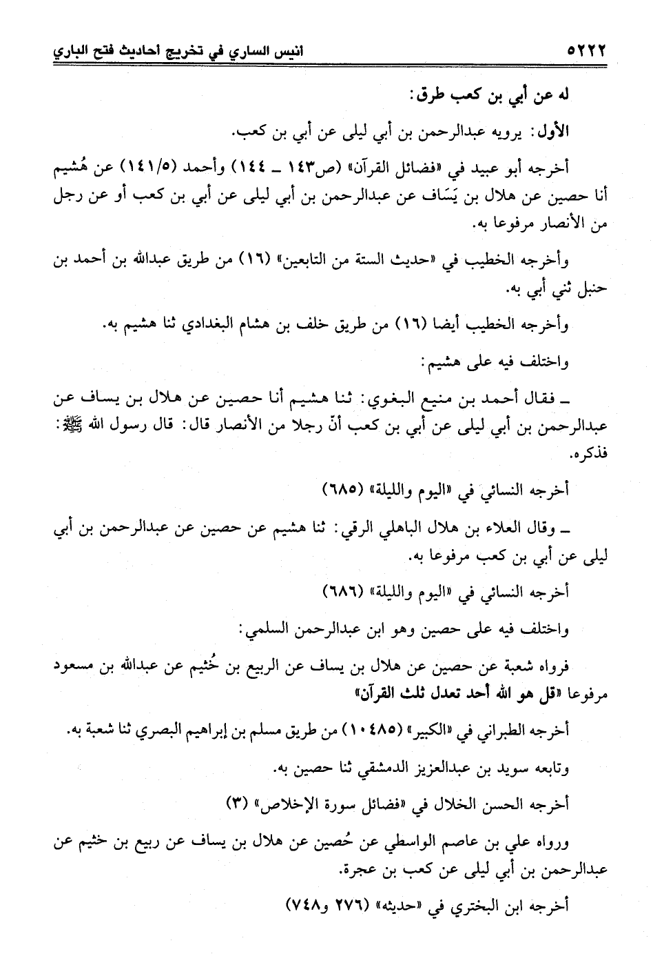 - فقال أحمد بن منيع البغوي: ثنا هشيم أنا حصين عن هلال بن يساف عن عبد الرحمن بن أبي ليلى عن أبي بن كعب أنّ رجلاً من الأنصار قال: قال رسول الله - صلى الله عليه وسلم -: فذكره.