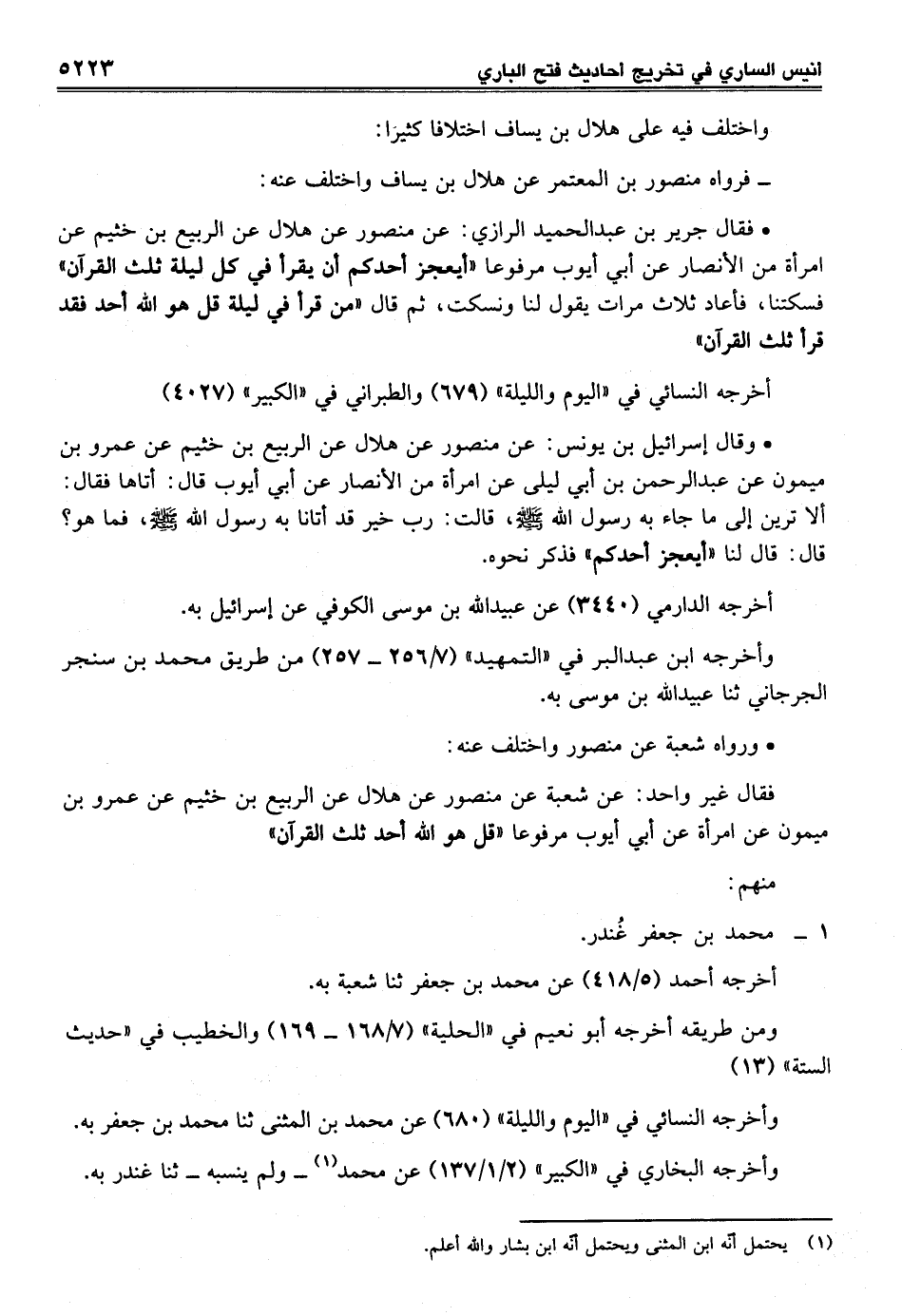 • فقال جرير بن عبد الحميد الرازي: عن منصور عن هلال عن الربيع بن خثيم عن امرأة من الأنصار عن أبي أيوب مرفوعاً "أيعجز أحدكم أن يقرأ في كل ليلة ثلث القرآن" فسكتنا، فأعاد ثلاث مرات يقول لنا ونسكت، ثم قال "من قرأ في ليلة قل هو الله أحد فقد قرأ ثلث القرآن"