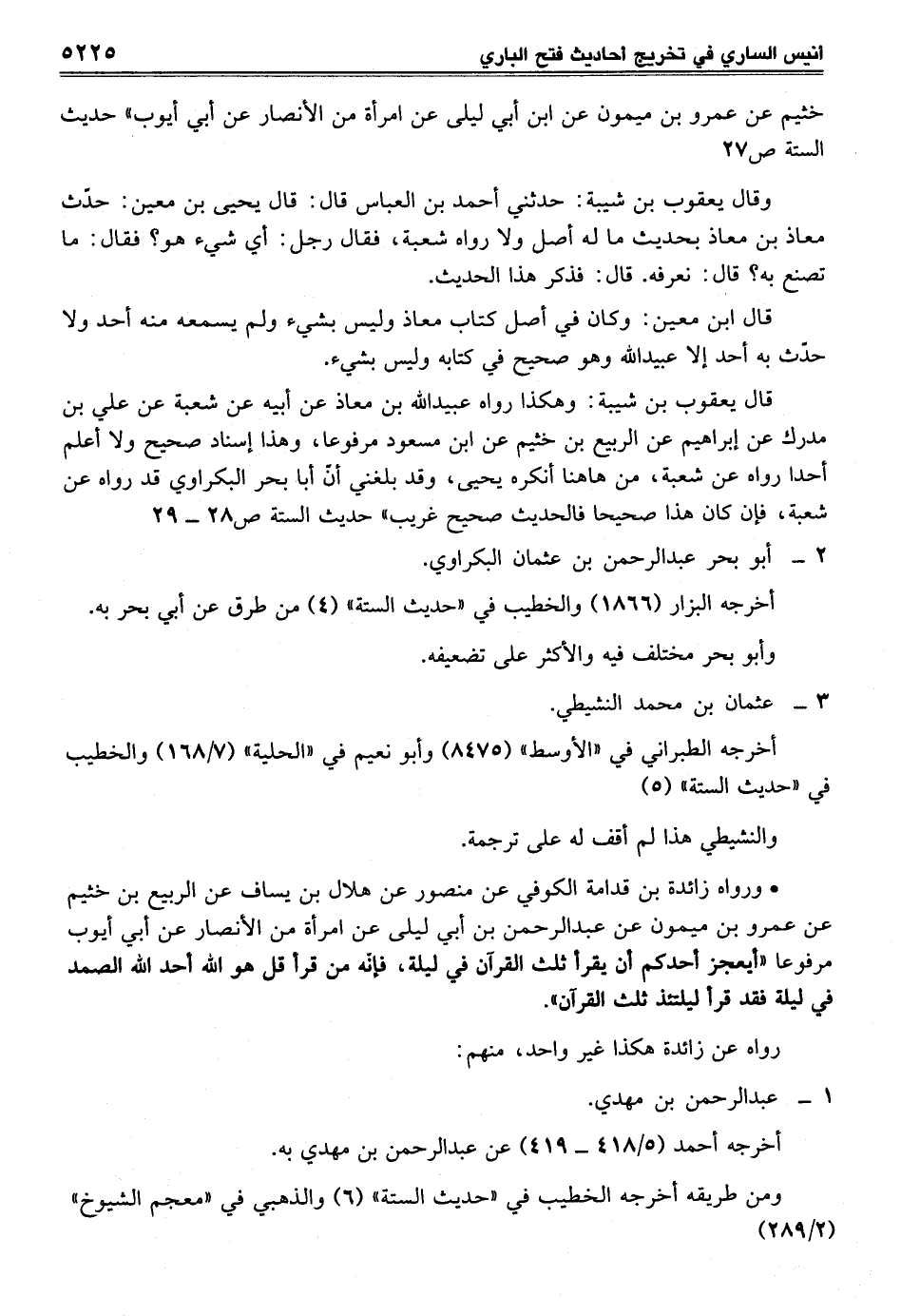 • ورواه زائدة بن قدامة الكوفي عن منصور عن هلال بن يساف عن الربيع بن خثيم عن عمرو بن ميمون عن عبد الرحمن بن أبي ليلى عن امرأة من الأنصار عن أبي أيوب مرفوعاً "أيعجز أحدكم أن يقرأ ثلث القرآن في ليلة، فإنّه من قرأ قل هو الله أحد الله الصمد في ليلة فقد قرأ ليلتئذ ثلث القرآن".