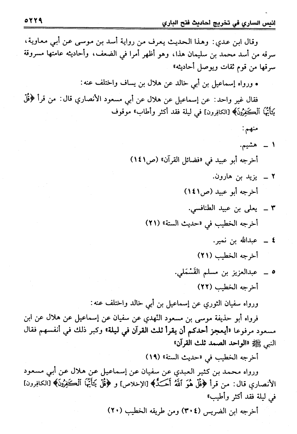 ورواه محمد بن كثير العبدي عن سفيان عن إسماعيل عن هلال عن أبي مسعود الأنصاري قال: من قرأ {قُلْ هُوَ اللَّهُ أَحَدٌ} [الإخلاص]، و {قُلْ يَا أَيُّهَا الْكَافِرُونَ} [الكافرون] في ليلة فقد أكثر وأطيب"