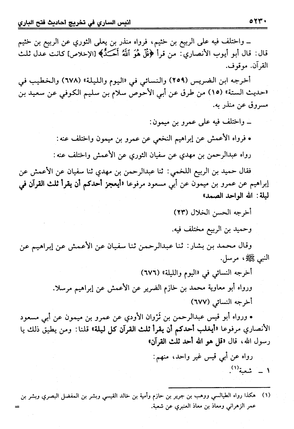 فقال حميد بن الربيع اللخمي: ثنا عبد الرحمن بن مهدي ثنا سفيان عن الأعمش عن إبراهيم عن عمرو بن ميمون عن أبي مسعود مرفوعاً "أيعجز أحدكم أن يقرأ ثلث القرآن في ليلة: الله الواحد الصمد"