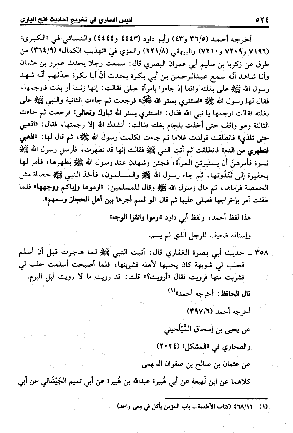 أخرجه أحمد (5/ 36 و 43) وأبو داود (4443 و 4444) والنسائي في "الكبرى" (7196 و 7209 و 7210) والبيهقي (8/ 221) والمزي في "تهذيب الكمال" (9/ 364) من طرق عن زكريا بن سليم أبي عمران البصري قال: سمعت رجلا يحدث عمرو بن عثمان وأنا شاهد أنّه سمع عبد الرحمن بن أبي بكرة يحدث أن أبا بكرة حدّثهم أنّه شهد رسول الله - صلى الله عليه وسلم - على بغلته واقفا إذ جاءوا بامرأة حبلى فقالت: إنها زنت أو بغت فارجمها، فقال لها رسول الله - صلى الله عليه وسلم - "استتري بستر الله عز وجل" فرجعت ثم جاءت الثانية والنبي - صلى الله عليه وسلم - على بغلته فقالت ارجمها يا نبي الله فقال: "استتري بستر الله تبارك وتعالى" فرجعت ثم جاءت الثالثة وهو واقف حتى أخذت بلجام بغلته فقالت: أنشدك الله إلا رجمتها، فقال: "اذهبي حتى تلدي" فانطلقت فولدت غلاما ثم جاءت فكلمت رسول الله - صلى الله عليه وسلم -، ثم قال لها: "اذهبي فتطهري من الدم" فانطلقت ثم أتت النبي - صلى الله عليه وسلم - فقالت إنها قد تطهرت، فأرسل رسول الله - صلى الله عليه وسلم - نسوة فأمرهن أن يستبرئن المرأة، فجئن وشهدن عند رسول الله - صلى الله عليه وسلم - بطهرها، فأمر لها بحفرة إلى ثَنْدُوتها، ثم جاء رسول الله - صلى الله عليه وسلم - والمسلمون، فأخذ النبي - صلى الله عليه وسلم - حصاة مثل الحمصة فرماها، ثم مال رسول الله - صلى الله عليه وسلم - وقال للمسلمين: "ارموها وإياكم ووجهها" فلما طفئت أمر بإخراجها فصلى عليها ثم قال "لو قسم أجرها بين أهل الحجاز وسعهم".