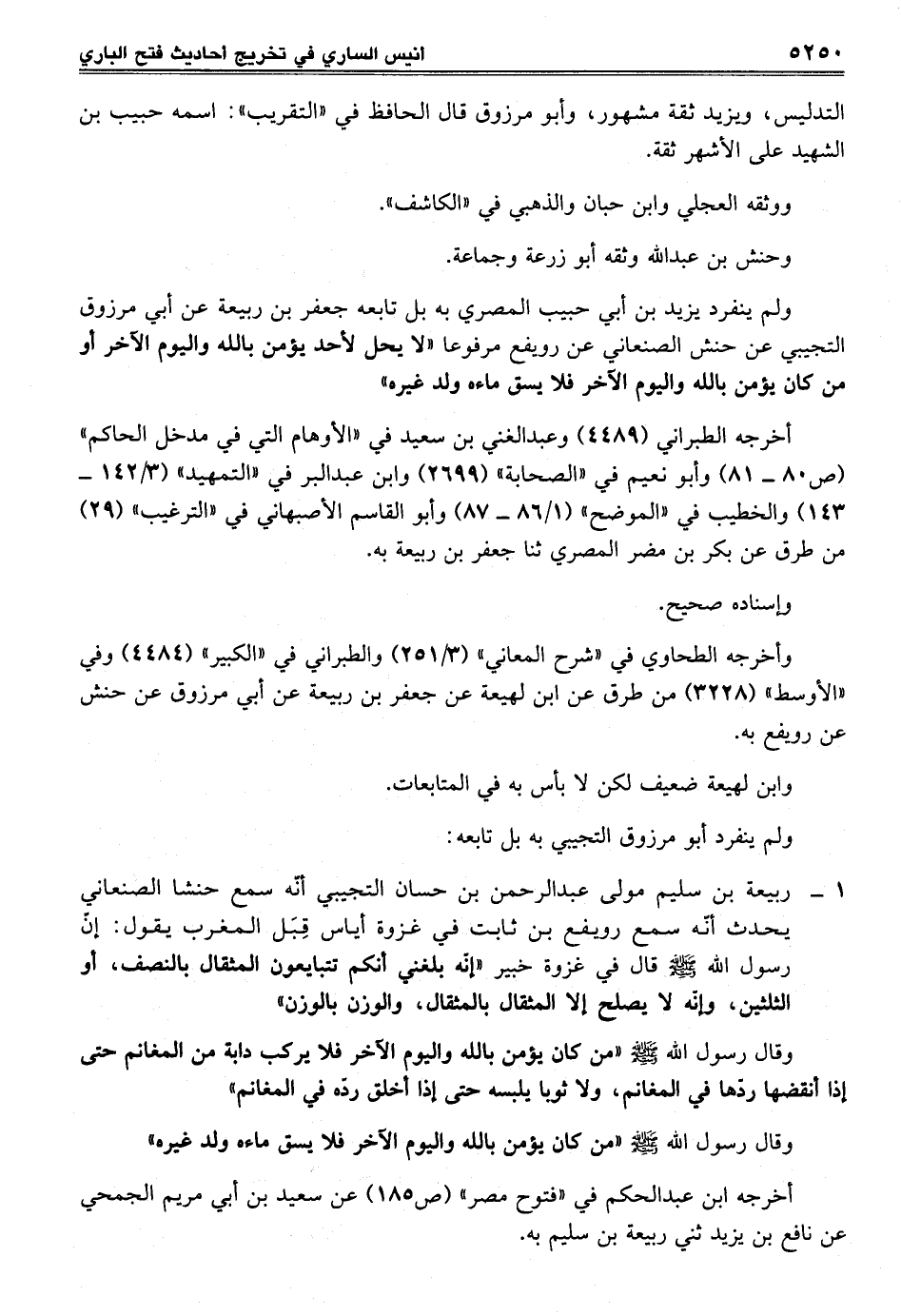 ولم ينفرد يزيد بن أبي حبيب المصري به بل تابعه جعفر بن ربيعة عن أبي مرزوق التجيبي عن حنش الصنعاني عن رويفع مرفوعاً "لا يحل لأحد يؤمن بالله واليوم الآخر أو من كان يؤمن بالله واليوم الآخر فلا يسق ماءه ولد غيره"