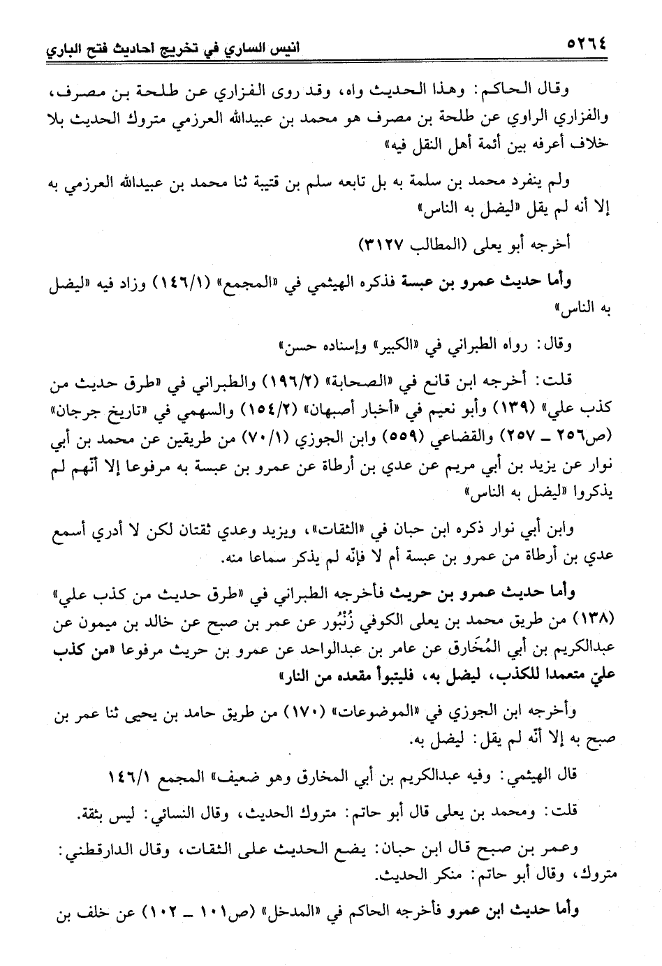 وقال الحاكم: وهذا الحديث واه، وقد روى الفزاري عن طلحة بن مصرف، والفزاري الراوي عن طلحة بن مصرف هو محمد بن عبيد الله العرزمى متروك الحديث بلا خلاف أعرفه بين أئمة أهل النقل فيه"