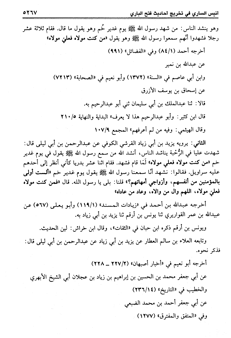 الثاني: يرويه يزيد بن أبي زياد القرشي الكوفي عن عبد الرحمن بن أبي ليلى قال: شهدت عليا في الرُّحْبة يناشد الناس، أنشد الله من سمع رسول الله - صلى الله عليه وسلم - يقول في يوم غدير خم "من كنت مولاه فعلي مولاه" لَمَا قام فشهد. فقام اثنا عشر بدريا كأني انظر إلى أحدهم عليه سراويل. فقالوا: نشهد أنّا سمعنا رسول الله - صلى الله عليه وسلم - يقول يوم غدير خم "ألست أولى بالمؤمنين من أنفسهم، وأزواجي أمهاتهم؟ " قلنا: بلى يا رسول الله. قال "فمن كنت مولاه فعليّ مولاه، اللهم وال من والاه، وعاد من عاداه"