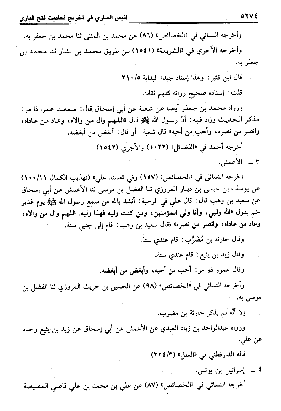 ورواه محمد بن جعفر أيضاً عن شعبة عن أبي إسحاق قال: سمعت عمرا ذا مر: فذكر الحديث وزاد فيه: أنّ رسول الله - صلى الله عليه وسلم - قال "اللهم وال من والاه، وعاد من عاداه، وانصر من نصره، وأحب من أحبه" قال شعبة: أو قال: أبغض من أبغضه.