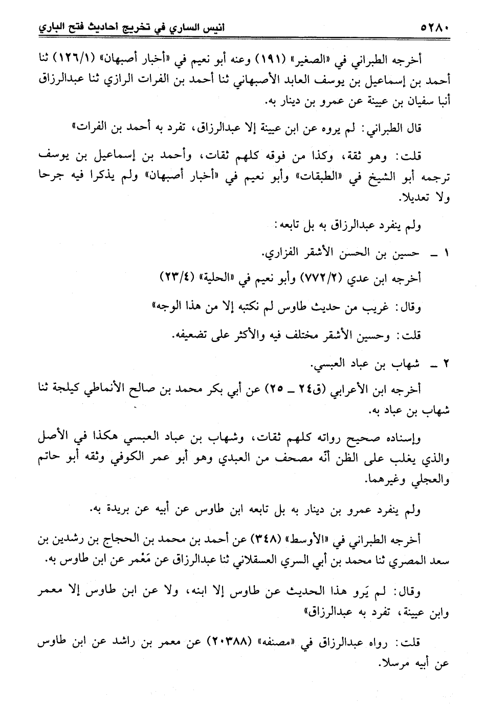 وقال: لم يَرو هذا الحديث عن طاوس إلا ابنه، ولا عن ابن طاوس إلا معمر وابن عيينة، تفرد به عبد الرزاق"