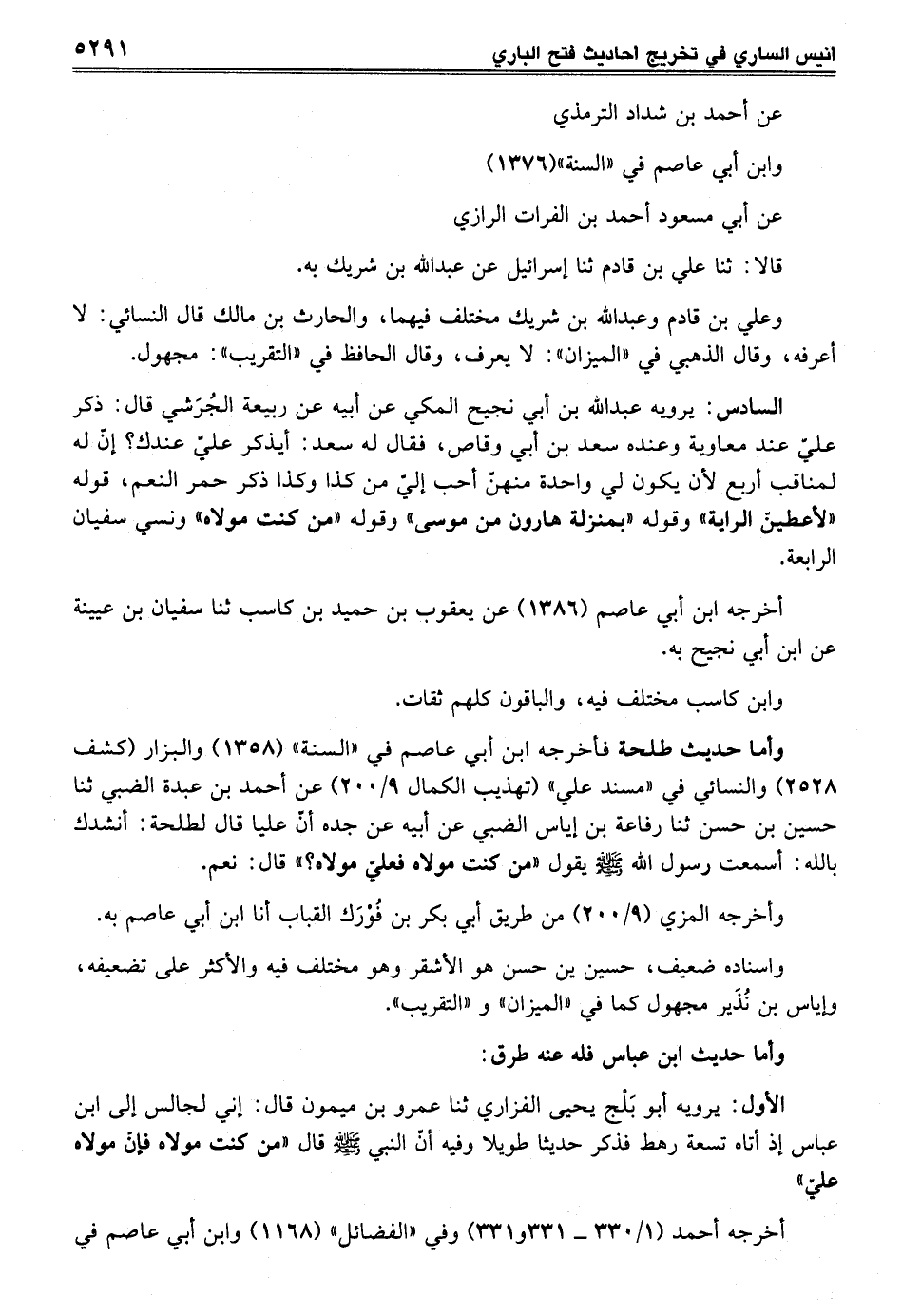 وأما حديث طلحة فأخرجه ابن أبي عاصم في "السنة" والبزار (كشف 2528) والنسائي في "مسند علي" (تهذيب الكمال 9/ 200) عن أحمد بن عبدة الضبي ثنا حسين بن حسن ثنا رفاعة بن إياس الضبي عن أبيه عن جده أنّ عليا قال لطلحة: أنشدك بالله: أسمعت رسول الله - صلى الله عليه وسلم - يقول "من كنت مولاه فعليّ مولاه" قال: نعم.
