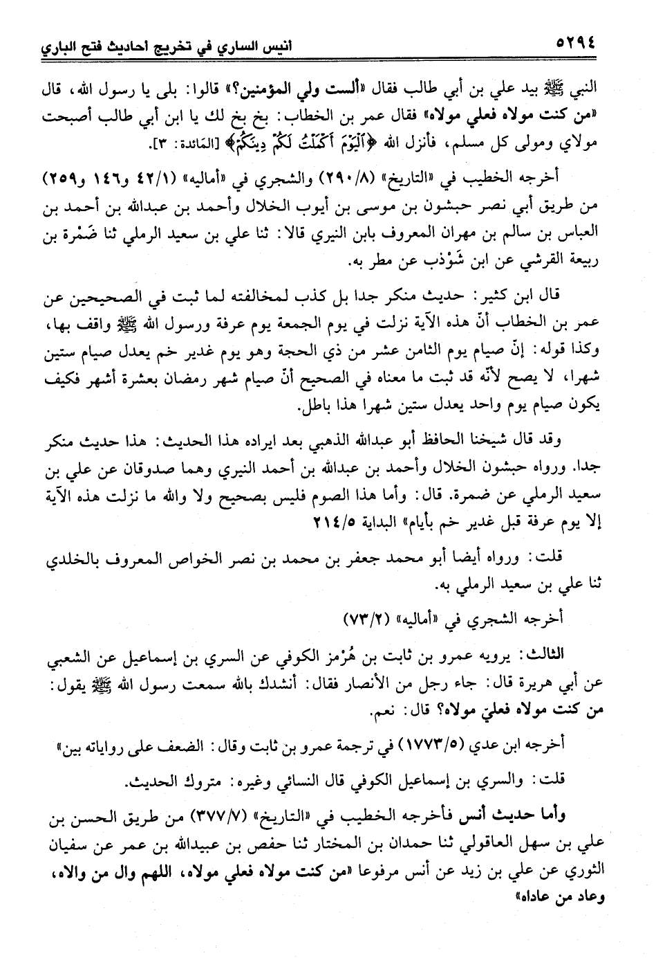 وقد قال شيخنا الحافظ أبو عبد الله الذهبي بعد ايراده هذا الحديث: هذا حديث منكر جداً. ورواه حبشون الخلال وأحمد بن عبد الله بن أحمد النيري وهما صدوقان عن علي بن سعيد الرملي عن ضمرة. قال: وأما هذا الصوم فليس بصحيح ولا والله ما نزلت هذه الآية إلا يوم عرفة قبل غدير خم بأيام" البداية 5/ 214