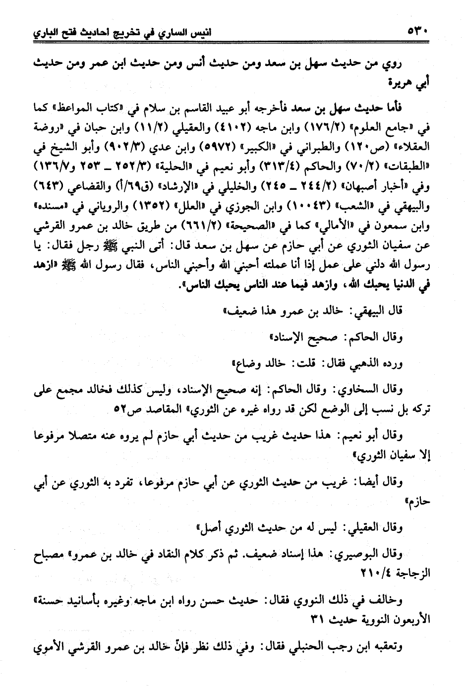 روي من حديث سهل بن سعد ومن حديث أنس ومن حديث ابن عمر ومن حديث أبى هريرة فأما حديث سهل بن سعد فأخرجه أبو عبيد القاسم بن سلام في "كتاب المواعظ" كما في "جامع العلوم" (2/ 176) وابن ماجه (4102) والعقيلي (2/ 11) وابن حبان في "روضة العقلاء" (ص 120) والطبراني في "الكبير" (5972) وابن عدي (3/ 902) وأبو الشيخ في "الطبقات" (2/ 70) والحاكم (4/ 313) وأبو نعيم في "الحلية" (3/ 252 - 253 و7/ 136) وفي "أخبار أصبهان" (2/ 244 - 245) والخليلي في "الإرشاد" (ق 69/أ) والقضاعي (643) والبيهقي في "الشعب" (10043) وابن الجوزي في "العلل" (1352) والروياني في "مسنده" وابن سمعون في "الأمالي" كما في "الصحيحة" (2/ 661) من طريق خالد بن عمرو القرشي عن سفيان الثوري عن أبي حازم عن سهل بن سعد قال: أتى النبي - صلى الله عليه وسلم - رجل فقال: يا رسول الله دلني على عمل إذا أنا عملته أحبني الله وأحبني الناس، فقال رسول الله - صلى الله عليه وسلم - "ازهد في الدنيا يحبك الله، وازهد فيما عند الناس يحبك الناس".