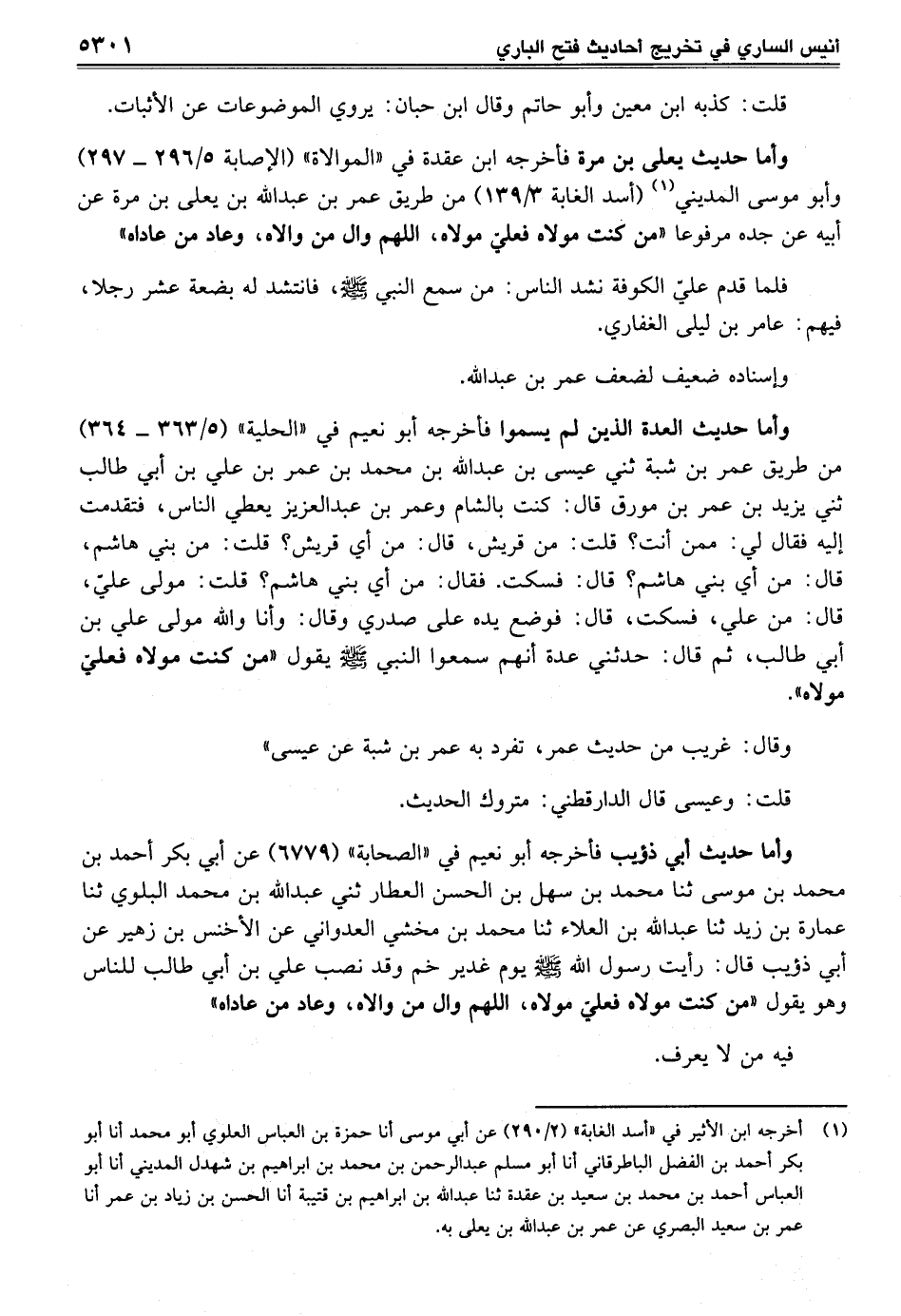 وأما حديث العدة الذين لم يسموا فأخرجه أبو نعيم في "الحلية" (5/ 363 - 364) من طريق عمر بن شبة ثني عيسى بن عبد الله بن محمد بن عمر بن علي بن أبي طالب ثني يزيد بن عمر بن مورق قال: كنت بالشام وعمر بن عبد العزيز يعطي الناس، فتقدمت إليه فقال لي: ممن أنت؟ قلت: من قريش، قال: من أي قريش؟ قلت: من بني هاشم، قال: من أي بني هاشم؟ قال: فسكت. فقال: من أي بني هاشم؟ قلت: مولى عليّ، قال: من علي، فسكت، قال: فوضع يده على صدري وقال: وأنا والله مولى علي بن أبي طالب، ثم قال: حدثني عدة أنهم سمعوا النبي - صلى الله عليه وسلم - يقول "من كنت مولاه فعليّ مولاه".