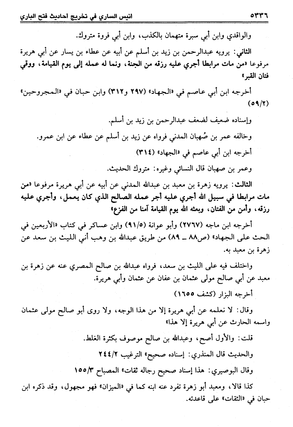 الثالث: يرويه زهرة بن معبد بن عبد الله المدني عن أبيه عن أبي هريرة مرفوعاً "من مات مرابطا في سبيل الله أجري عليه أجر عمله الصالح الذي كان يعمل، وأجري عليه رزقه، وأمن من الفتان، وبعثه الله يوم القيامة آمنا من الفزع"