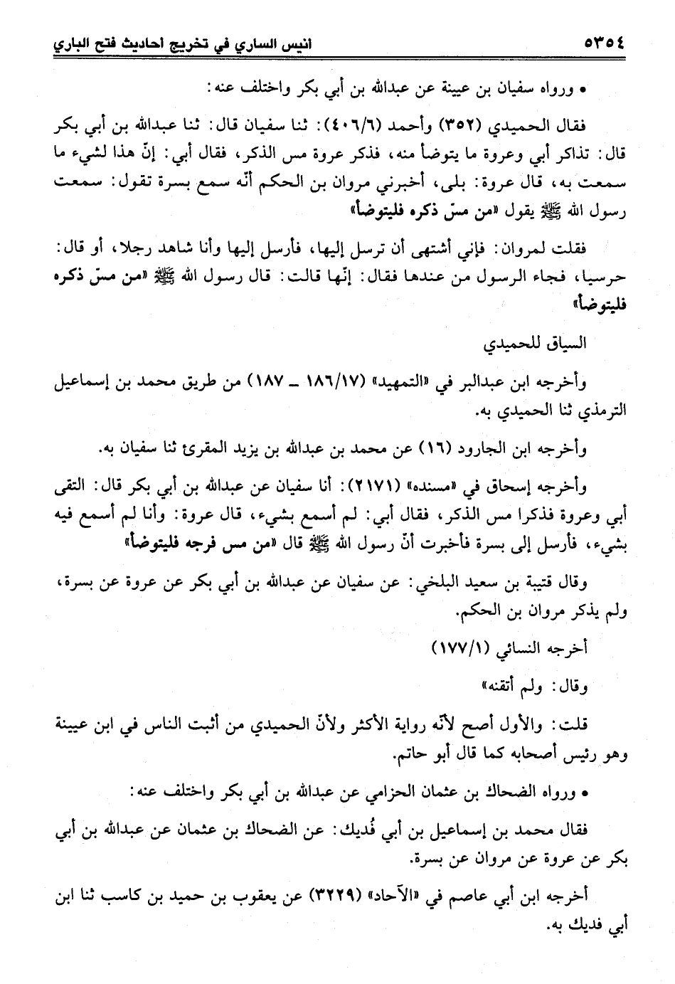 فقال الحميدي (352) وأحمد (6/ 406): ثنا سفيان قال: ثنا عبد الله بن أبي بكر قال: تذاكر أبي وعروة ما يتوضأ منه، فذكر عروة مس الذكر، فقال أبي: إنّ هذا لشيء ما سمعت به، قال عروة: بلى، أخبرني مروان بن الحكم أنّه سمع بسرة تقول: سمعت رسول الله - صلى الله عليه وسلم - يقول "من مسّ ذكره فليتوضأ"