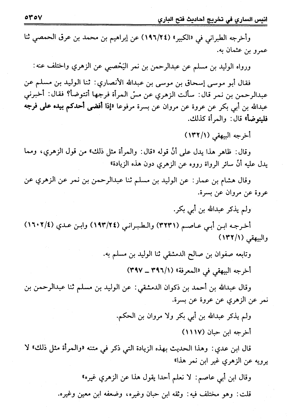 فقال أبو موسى إسحاق بن موسى بن عبد الله الأنصاري: ثنا الوليد بن مسلم عن عبد الرحمن بن نمر قال: سألت الزهري عن مسّ المرأة فرجها أتتوضأ؟ فقال: أخبرني عبد الله بن أبي بكر عن عروة عن مروان عن بسرة مرفوعاً "إذا أفضى أحدكم بيده على فرجه فليتوضأ" قال: والمرأة كذلك.