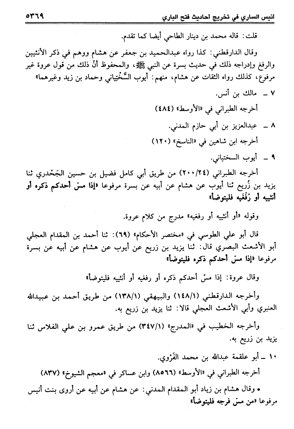 • وقال هشام بن زياد أبو المقدام المدني: عن هشام عن أبيه عن أروى بنت أنيس مرفوعاً "من مسّ فرجه فليتوضأ"