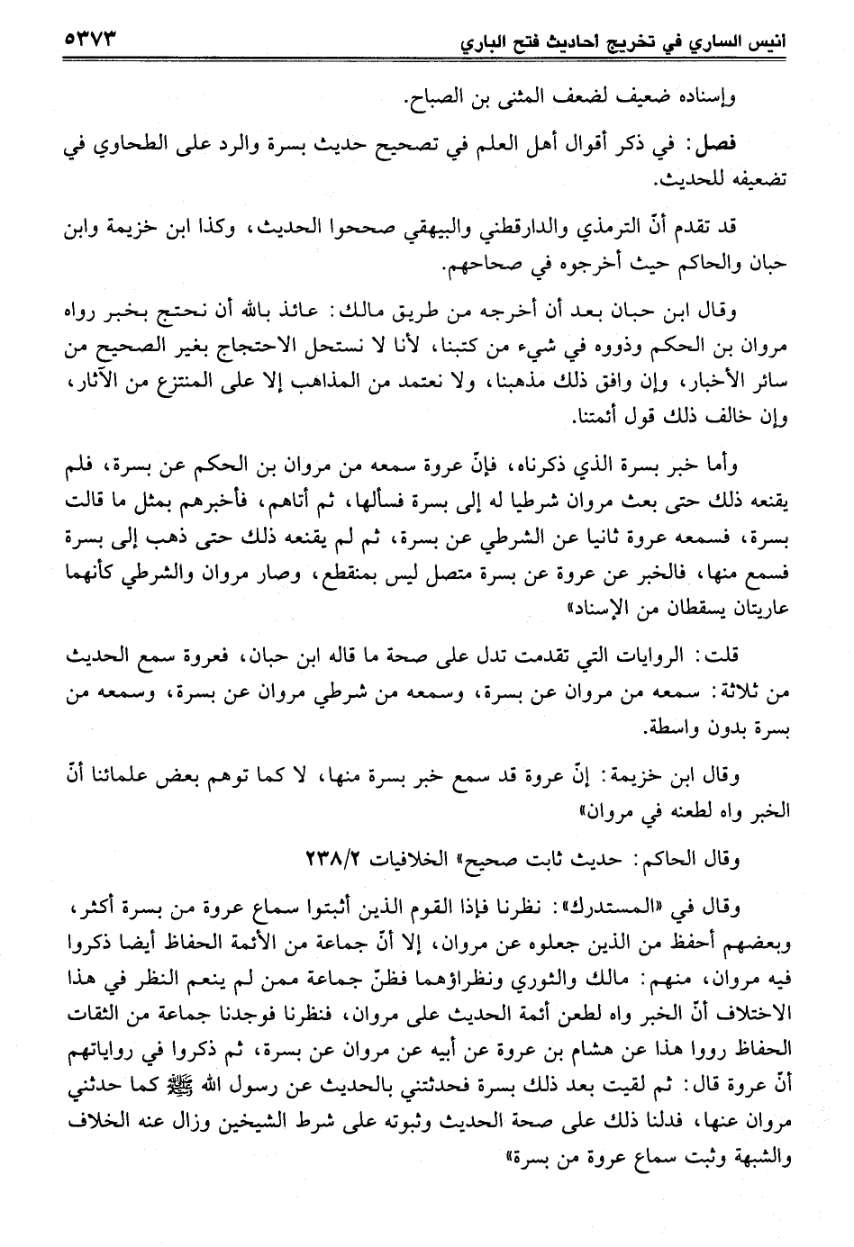 وقال في "المستدرك": نظرنا فإذا القوم الذين أثبتوا سماع عروة من بسرة أكثر، وبعضهم أحفظ من الذين جعلوه عن مروان، إلا أنّ جماعة من الأئمة الحفاظ أيضاً ذكروا فيه مروان، منهم: مالك والثوري ونظراؤهما فظنّ جماعة ممن لم ينعم النظر في هذا الاختلاف أنّ الخبر واه لطعن أئمة الحديث على مروان، فنظرنا فوجدنا جماعة من الثقات الحفاظ رووا هذا عن هشام بن عروة عن أبيه عن مروان عن بسرة، ثم ذكروا في رواياتهم أنّ عروة قال: ثم لقيت بعد ذلك بسرة فحدثتني بالحديث عن رسول الله - صلى الله عليه وسلم - كما حدثني مروان عنها، فدلنا ذلك على صحة الحديث وثبوته على شرط الشيخين وزال عنه الخلاف والشبهة وثبت سماع عروة من بسرة"