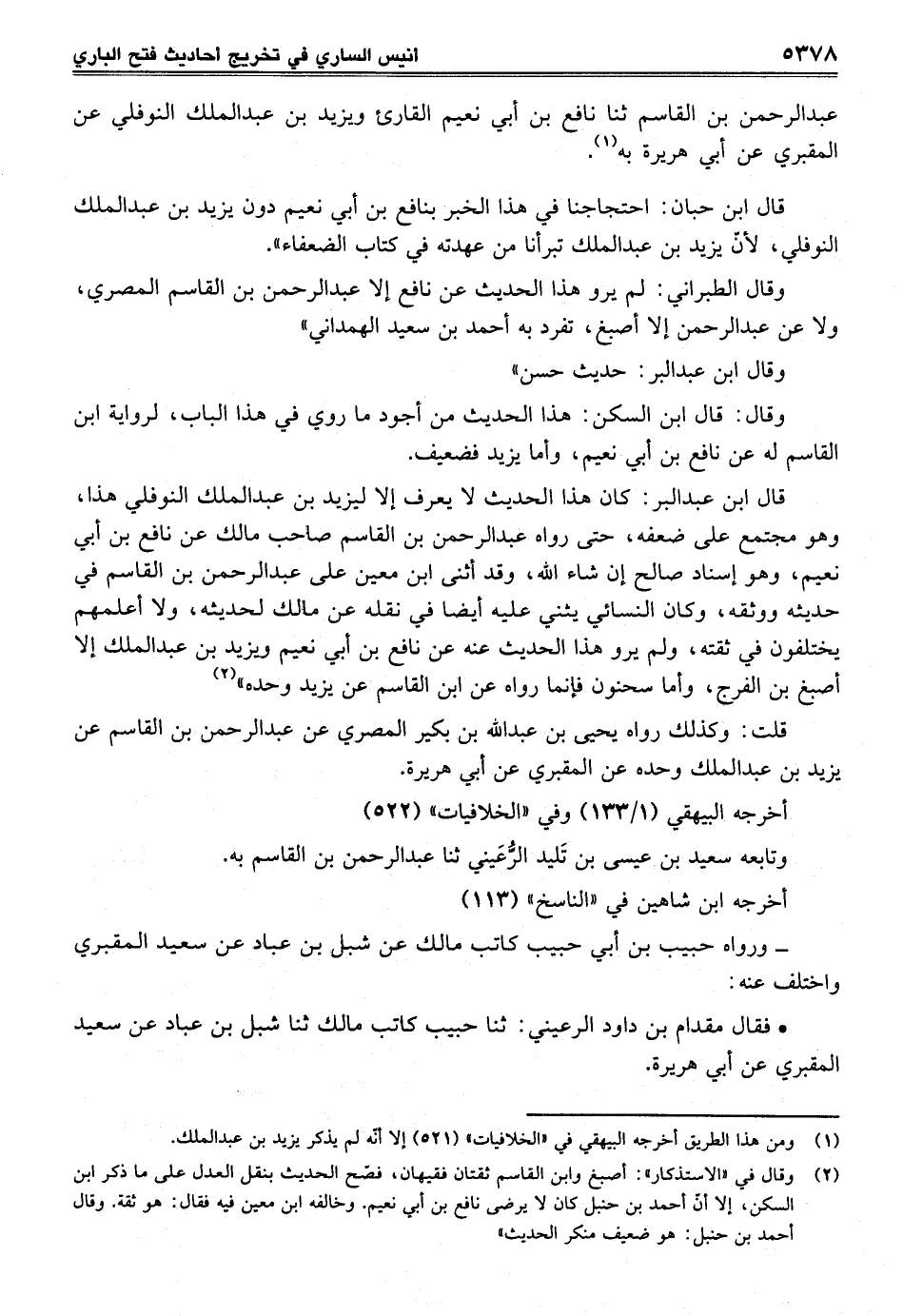 (¬2) وقال في "الاستذكار": أصبغ وابن القاسم ثقتان فقيهان، فصّح الحديث بنقل العدل على ما ذكر ابن السكن، إلا أنّ أحمد بن حنل كان لا يرضى نافع بن أبي نعيم. وخالفه ابن معين فيه فقال: هو ثقة. وقال أحمد بن حنبل: هو ضعيف منكر الحديث"