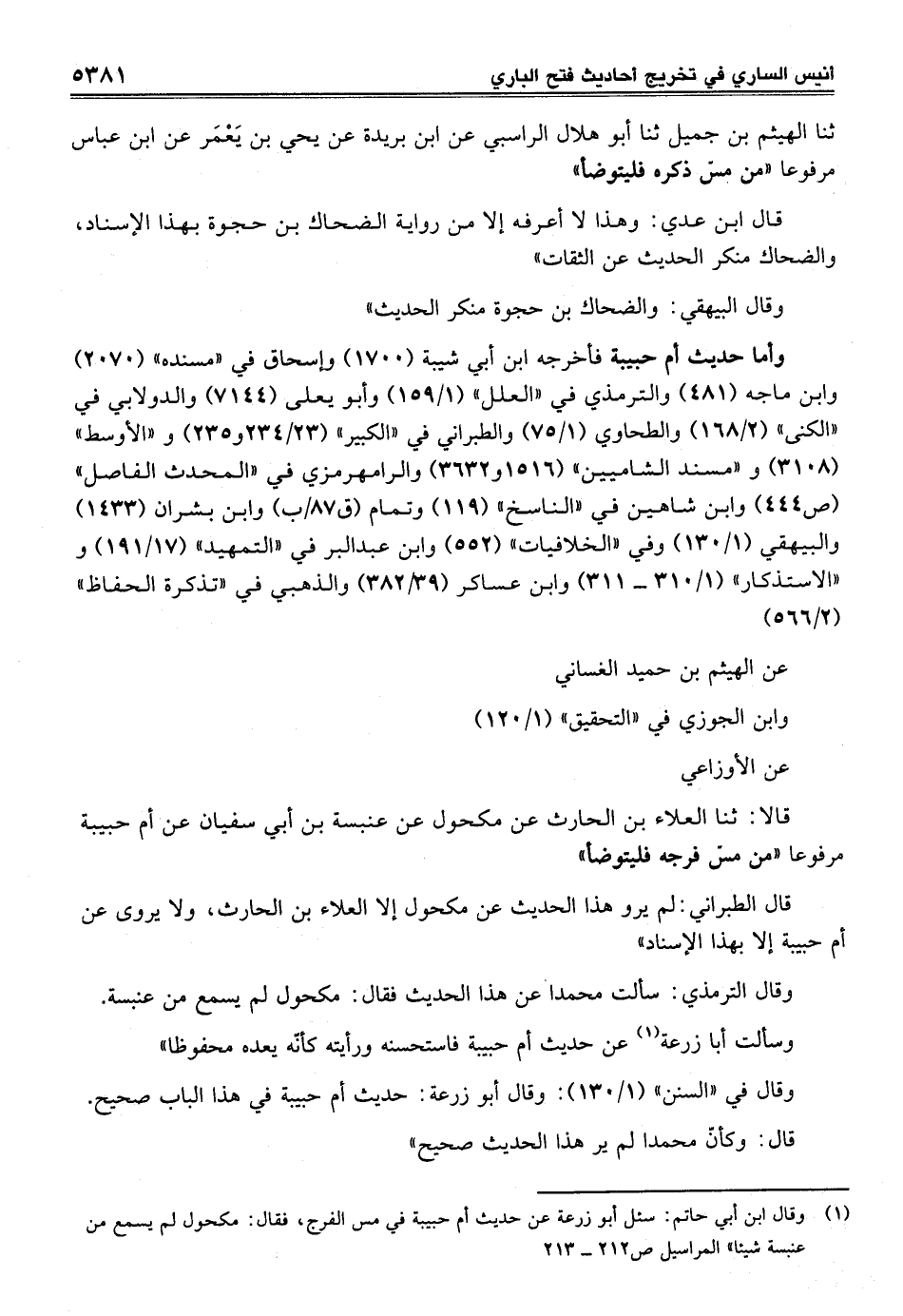 وأما حديث أم حبيبة فأخرجه ابن أبي شيبة (1700) وإسحاق في "مسنده" (2070) وابن ماجه (481) والترمذي في "العلل" (1/ 159) وأبو يعلى (7144) والدولابي في "الكنى" (2/ 168) والطحاوي (1/ 75) والطبراني في "الكبير" (23/ 234 و 235) و"الأوسط" (3108) و"مسند الشاميين" (1516 و 3632) والرامهرمزي في "المحدث الفاصل" (ص 444) وابن شاهين في "الناسخ" (119) وتمام (ق 87/ ب) وابن بشران (1433) والبيهقي (1/ 130) وفي "الخلافيات" (552) وابن عبد البر في "التمهيد" (17/ 191) و "الاستذكار" (1/ 310 - 311) وابن عساكر (39/ 382) والذهبي في "تذكرة الحفاظ" (2/ 566)