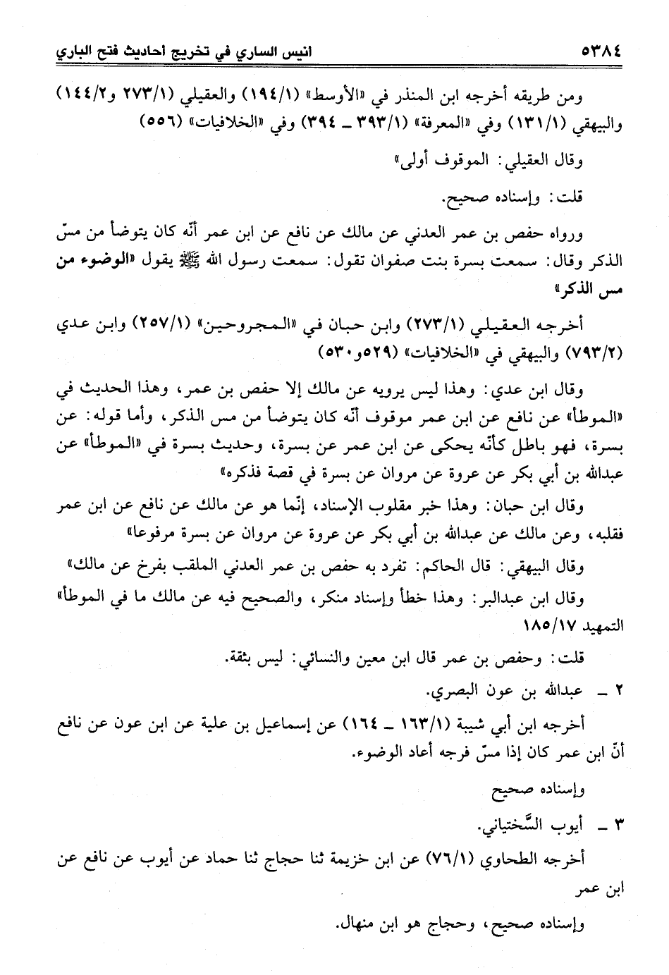 ورواه حفص بن عمر العدني عن مالك عن نافع عن ابن عمر أنّه كان يتوضأ من مسّ الذكر وقال: سمعت بسرة بنت صفوان تقول: سمعت رسول الله - صلى الله عليه وسلم - يقول "الوضوء من مس الذكر"