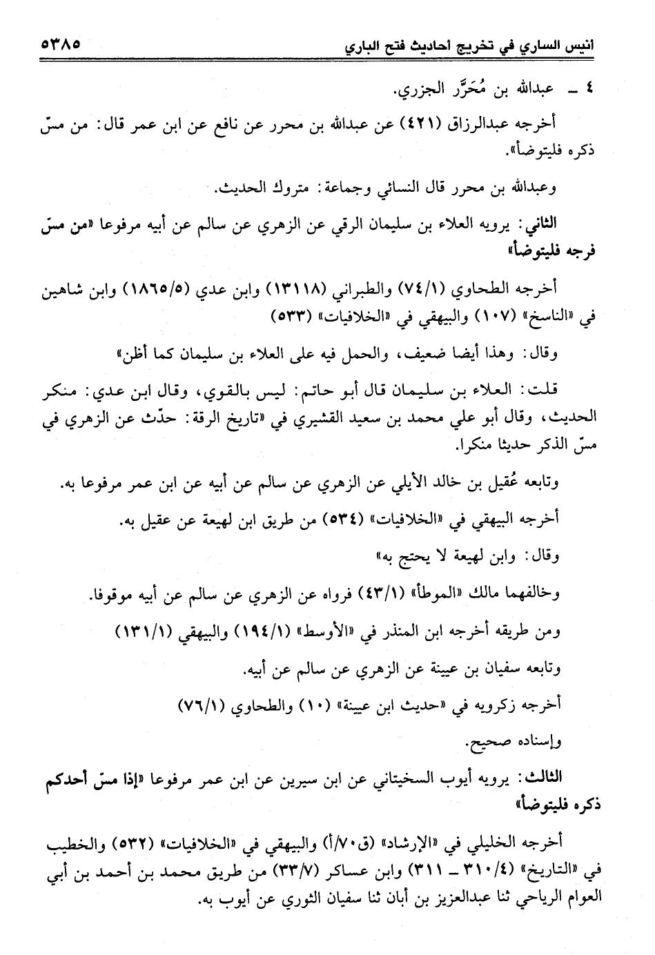 الثاني: يرويه العلاء بن سليمان الرقي عن الزهري عن سالم عن أبيه مرفوعا "من مسّ فرجه فليتوضأ"
