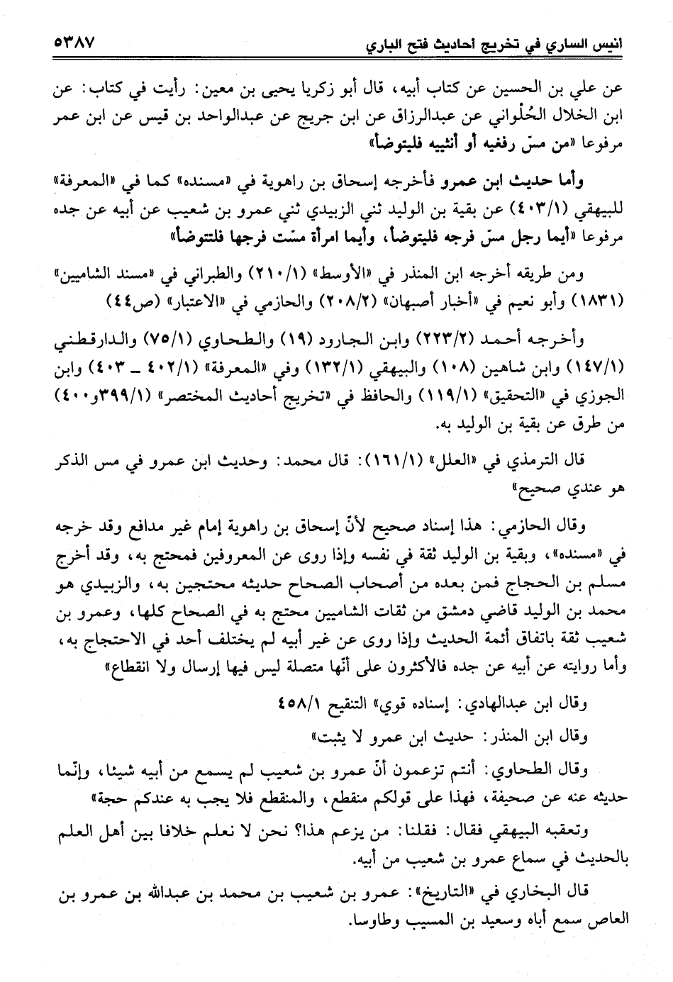 وقال الحازمي: هذا إسناد صحيح لأنّ إسحاق بن راهوية إمام غير مدافع وقد خرجه في "مسنده"، وبقية بن الوليد ثقة في نفسه وإذا روى عن المعروفين فمحتج به، وقد أخرج مسلم بن الحجاج فمن بعده من أصحاب الصحاح حديثه محتجين به، والزبيدي هو محمد بن الوليد قاضي دمشق من ثقات الشاميين محتج به في الصحاح كلها، وعمرو بن شعيب ثقة باتفاق أئمة الحديث وإذا روى عن غير أبيه لم يختلف أحد في الاحتجاج به، وأما روايته عن أبيه عن جده فالأكثرون على أنّها متصلة ليس فيها إرسال ولا انقطاع"