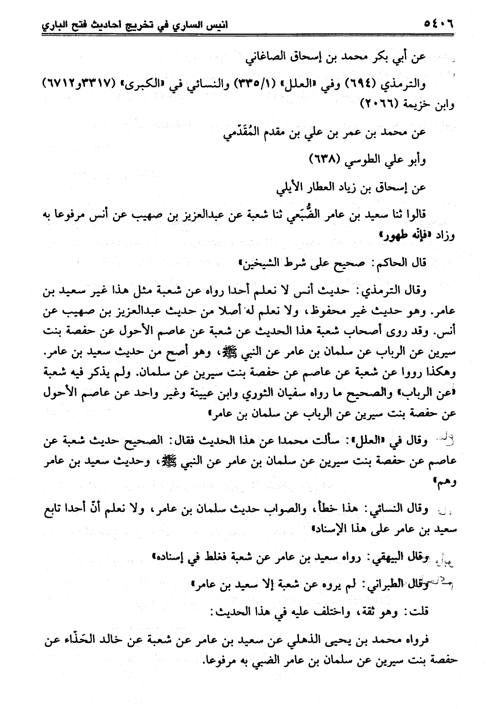 وقال الترمذي: حديث أنس لا نعلم أحدا رواه عن شعبة مثل هذا غير سعيد بن عامر. وهو حديث غير محفوظ، ولا نعلم له أصلًا من حديث عبد العزيز بن صهيب عن أنس. وقد روى أصحاب شعبة هذا الحديث عن شعبة عن عاصم الأحول عن حفصة بنت سيرين عن الرباب عن سلمان بن عامر عن النبي - صلى الله عليه وسلم -، وهو أصح من حديث سعيد بن عامر. وهكذا رووا عن شعبة عن عاصم عن حفصة بنت سيرين عن سلمان. ولم يذكر فيه شعبة "عن الرباب" والصحيح ما رواه سفيان الثوري وابن عيينة وغير واحد عن عاصم الأحول عن حفصة بنت سيرين عن الرباب عن سلمان بن عامر"