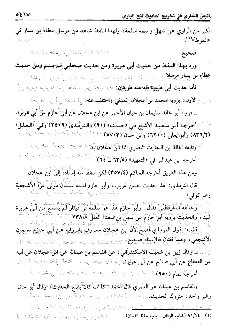 قلت: قول الترمذي أصح لأنّ ابن عجلان معروف بالرواية عن أبي حازم سلمان الأشجعي, وهما ثقتان فالإسناد صحيح.