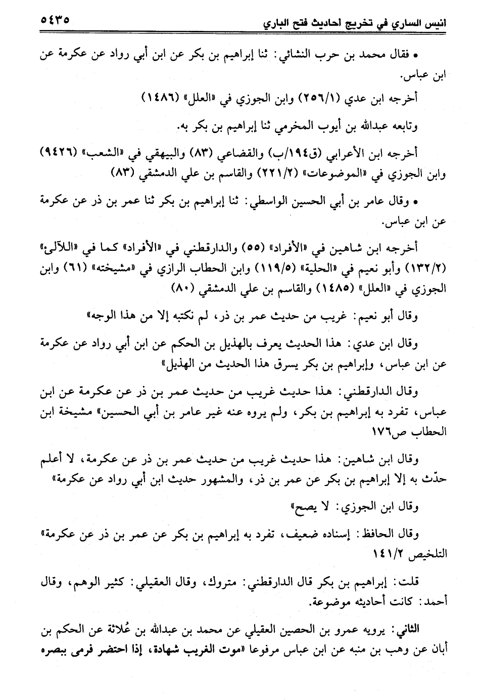وقال ابن شاهين: هذا حديث غريب من حديث عمر بن ذر عن عكرمة، لا أعلم حدّث به إلا إبراهيم بن بكر عن عمر بن ذر، والمشهور حديث ابن أبي رواد عن عكرمة"