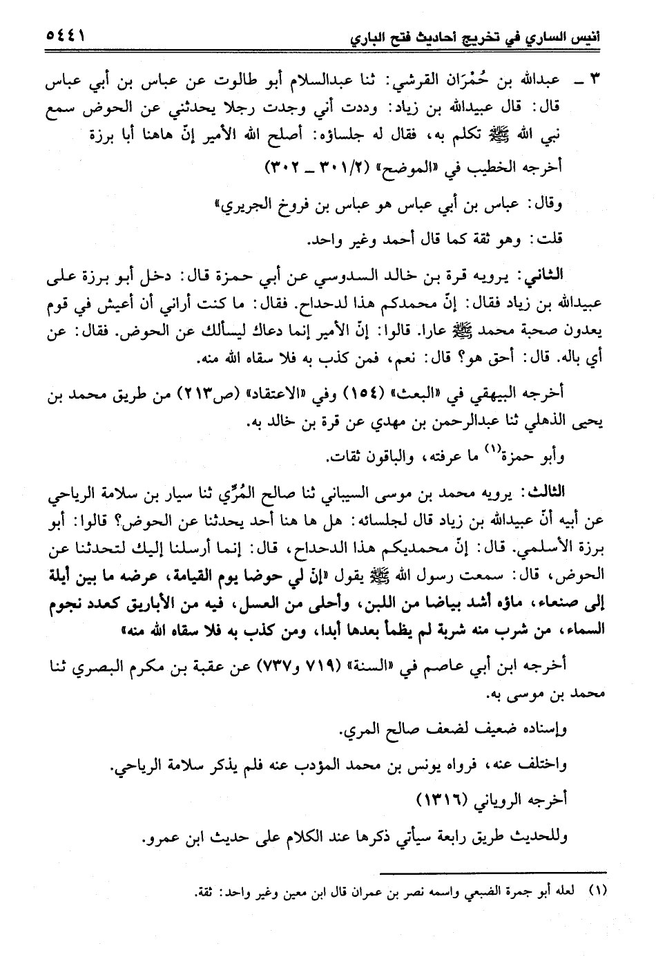 3 - عبد الله بن حُمْرَان القرشي: ثنا عبد السلام أبو طالوت عن عباس بن أبي عباس قال: قال عبيد الله بن زياد: وددت أني وجدت رجلاً يحدثني عن الحوض سمع نبي الله - صلى الله عليه وسلم - تكلم به، فقال له جلساؤه: أصلح الله الأمير إنّ هاهنا أبا برزة