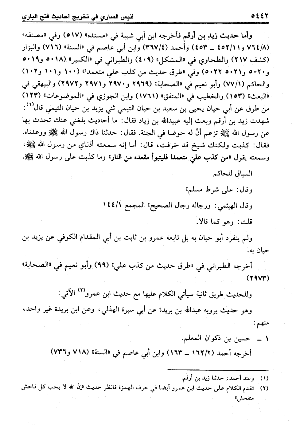 وأما حديث زيد بن أرقم فأخرجه ابن أبي شيبة في "مسنده" (517) وفي "مصنفه" (8/ 764 و 11/ 452 - 453) وأحمد (4/ 367) وابن أبي عاصم في "السنة" (716) والبزار (كشف 217) والطحاوي في "المشكل" (459) والطبراني في "الكبير" (5018 و 5019 و 5020 و 5021 و 5022) وفي "طرق حديث من كذب علي متعمدا" (100 و 101 و 102) والحاكم (1/ 77) وأبو نعيم في "الصحابة" (2969 و 2970 و 2971 و 2972) والبيهقي في "البعث" (153) والخطيب في "المتفق" (1761) وابن الجوزي في "الموضوعات" (123) من طرق عن أبي حيان يحيى بن سعيد بن حيان التيمي ثني يزيد بن حيان التيمي قال (¬1): شهدت زيد بن أرقم وبعث إليه عبيد الله بن زياد فقال: ما أحاديث بلغني عنك تحدث بها عن رسول الله - صلى الله عليه وسلم - تزعم أنّ له حوضا في الجنة. فقال: حدثنا ذاك رسول الله - صلى الله عليه وسلم - ووعدناه. فقال: كذبت ولكنك شيخ قد خرفت، قال: أما إنه سمعته أذناي من رسول الله - صلى الله عليه وسلم -، وسمعته يقول "من كذب علي متعمدا فليتبوأ مقعده من النار" وما كذبت على رسول الله - صلى الله عليه وسلم -.